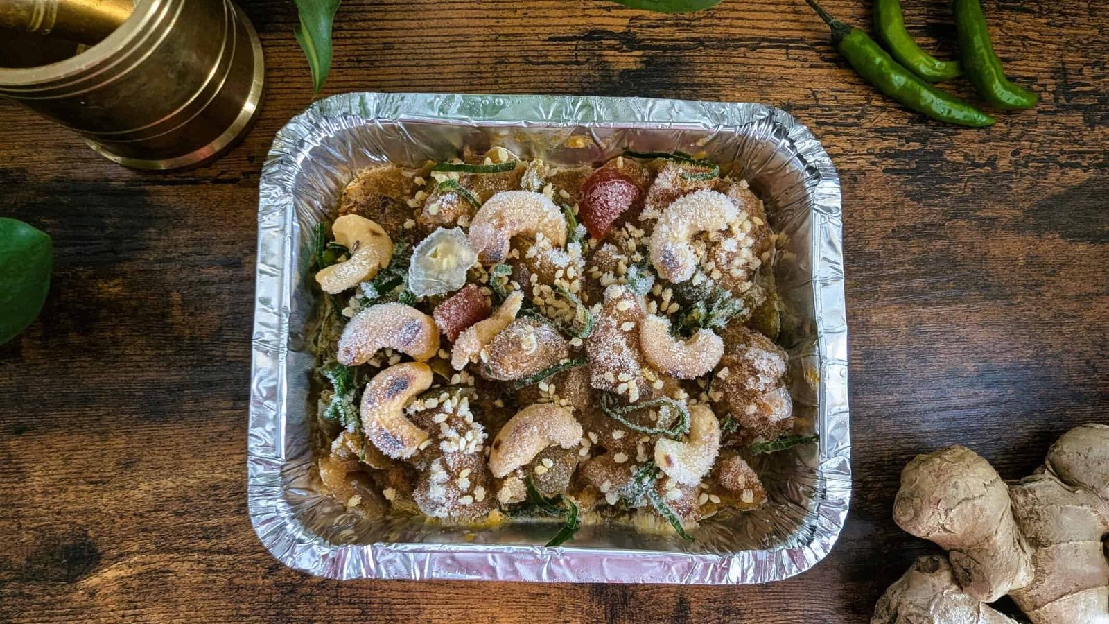 Marinated chicken pieces (free range; on the bone) lightly corn flour battered and fried w/ peppers & Indochinese sauce, topped w/ roasted cashews, spring onions & sesame seeds