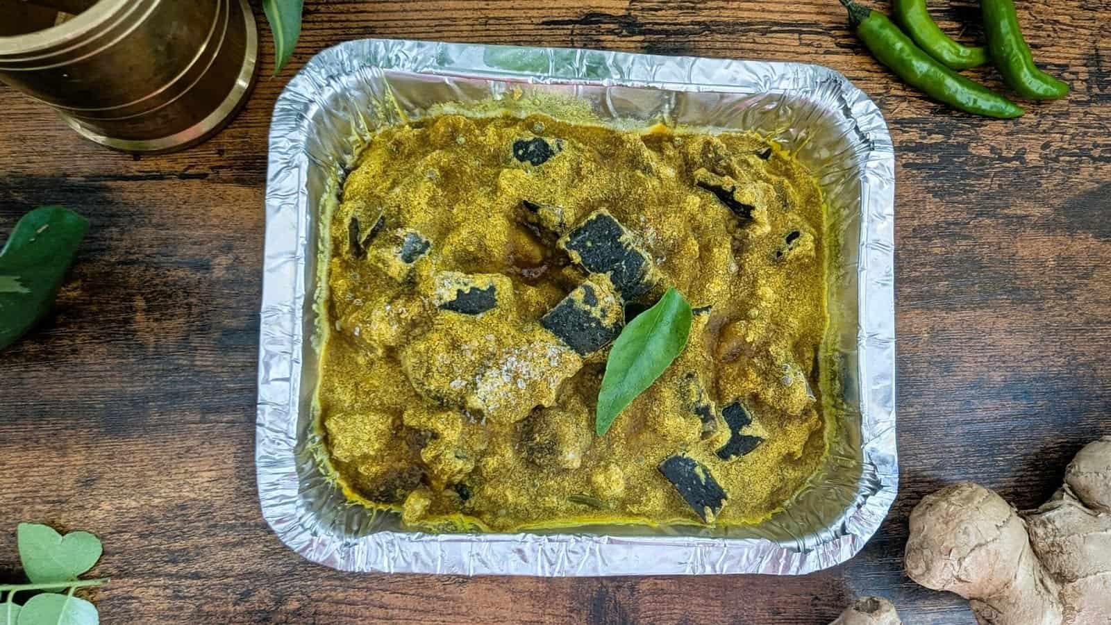 Brinjal cooked in a thick coconut blended gravy with spices.