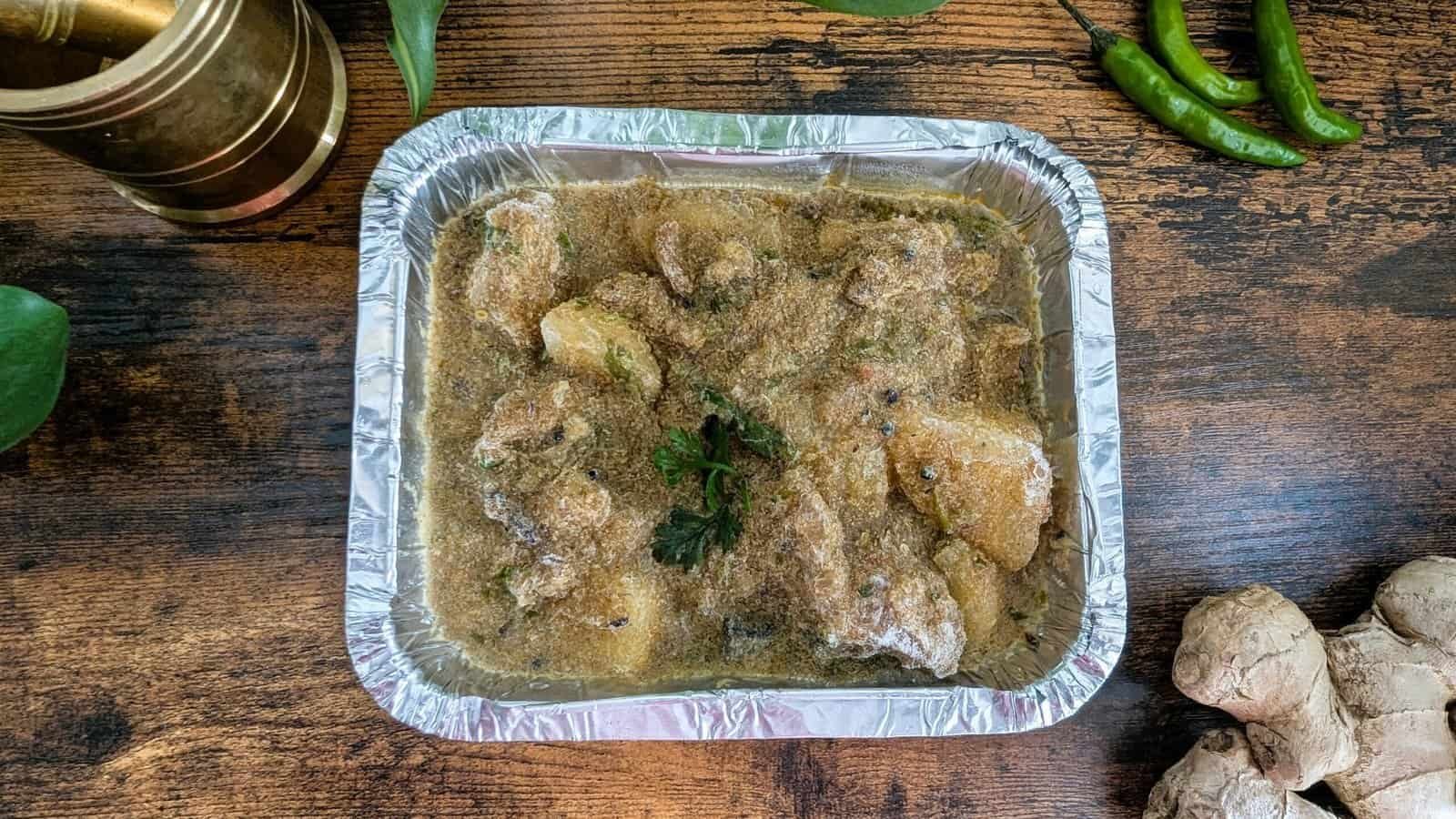 Free-range chicken (on the bone) w/ potatoes in a mild spicy coconut tomato masala gravy topped w/ fresh coriander
