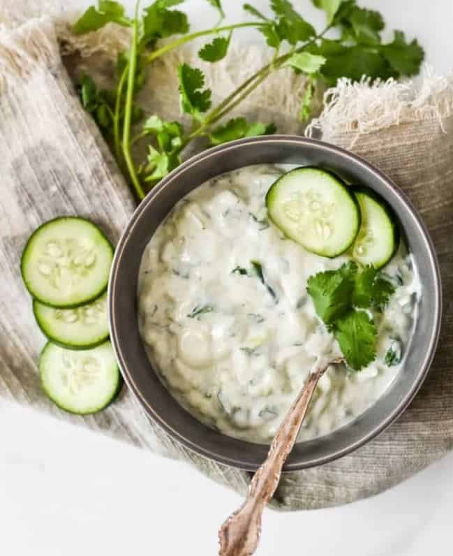 Yoghurt with red onion, green chilli, herbs & lemon – made on request.