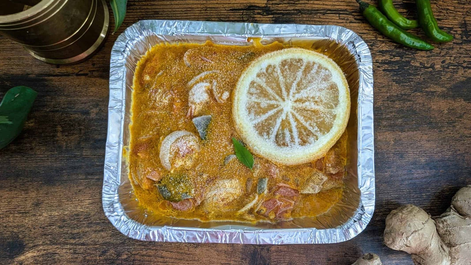 Lighly pan-fried salmon, prawns & cherry tomatoes in a mild coconut pepper turmeric gravy w/fresh curry leaves & topped w/ lemon