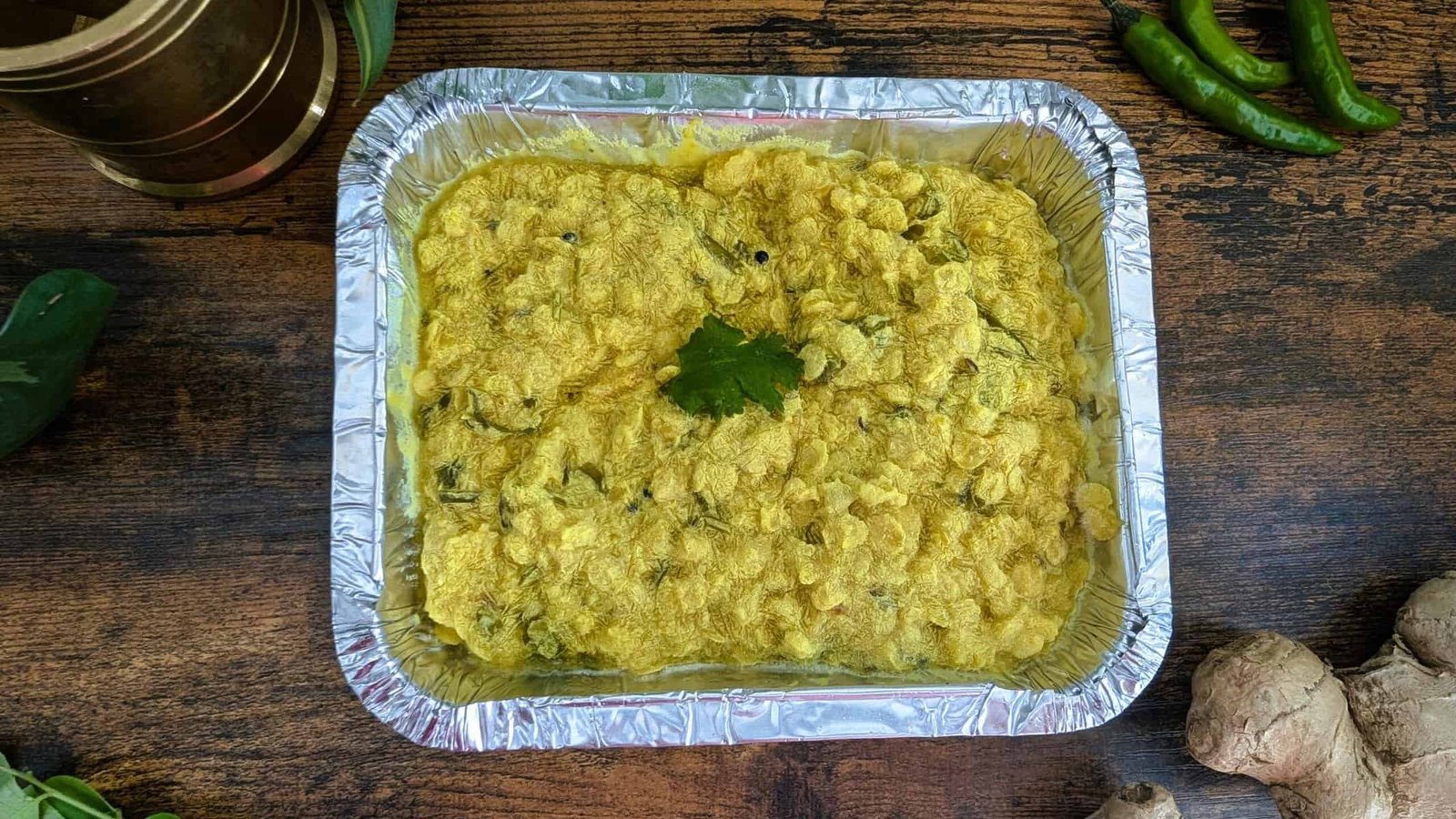 Red lentils in cooked with ghee, coconut, tomato topped w/ fried dried chilies, mustard seeds, curry leaves & fresh coriander